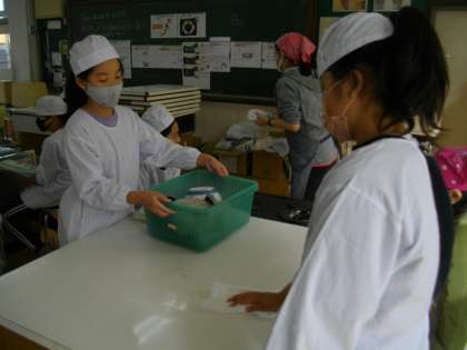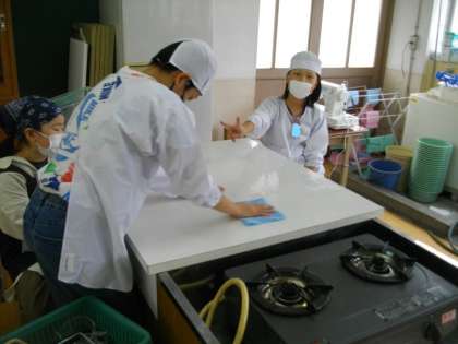 ガスこんろの使い方について学びました。消毒や食器運びも協力して行っていました。