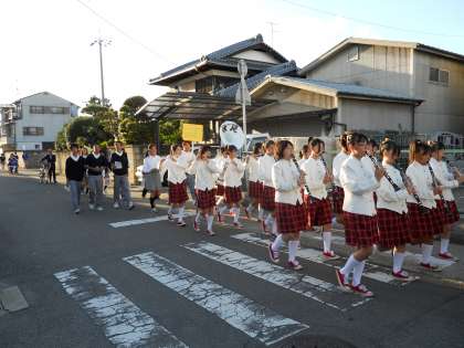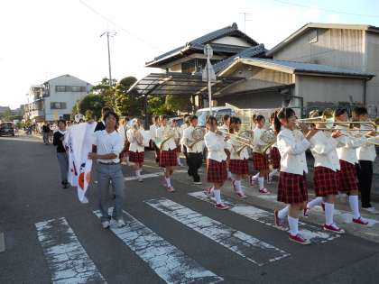 10月3日(月)放課後,威勢のいい行進曲が聞こえてきました。伏見中学校生徒会・吹奏楽部の生徒たちのパレード隊です。伏中祭に向けてのパフォーマンスです!教職員と部活をしていた児童で出迎えました。活躍している卒業生の姿がとても恰好よかったです!