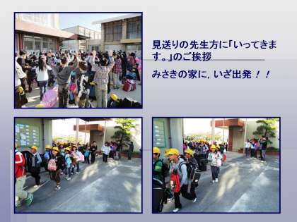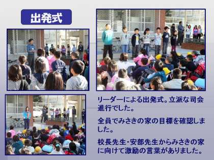 午前8時晴天の下,みさきの家の出発式が行われました。4年生80名。1人の欠席者もなく全員元気な挨拶で始まりました。司会のリーダーも大きな声ではきはきと会を進めています。全員でみさきの家の目標を確認しあい,みさきの家に出発しました。初めての宿泊学習ですが,きっと素晴らしい思い出をたくさんつくってくれると期待しています。