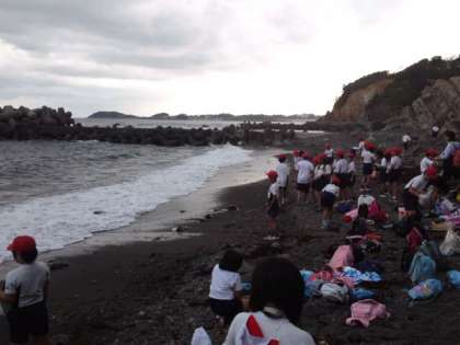 みんなで宮崎浜にやってきました。今日のこの時間帯は、潮があまり引いていません。小潮のため、干満の差が少ないのです。これはやむを得ないですね。