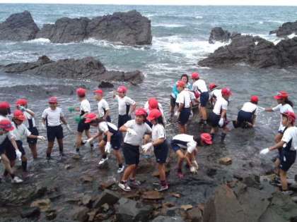 適当な場所を選んで、いよいよ海に入ります。みんな歓声をあげて喜んでいます。早速カニを見つけて、見せに来てくれた子どももいました。