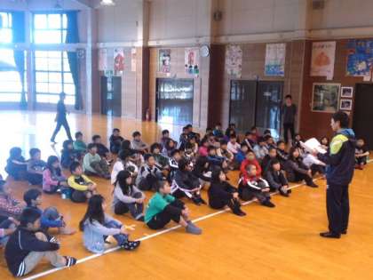 プレイホールで、学校ごとに朝のつどいを行いました。子どもたちは、きりっと引き締まった表情で、一日のスタートを切りました。