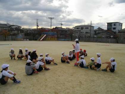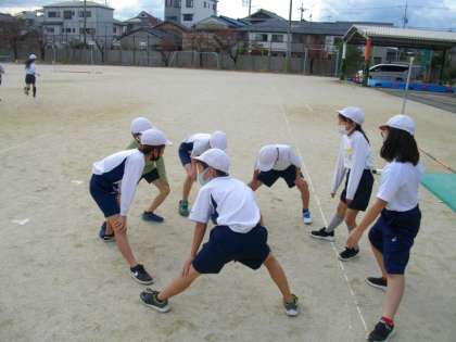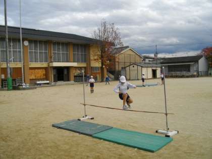 活動前には準備体操をしっかりと行っています。活動の手順や安全面の話を先生からきいた後,走り高とびスタートです。