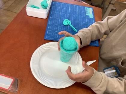 「ケーキができたよ!」「エビフライ作ったよ!」など自由な発想で楽しく活動していました。