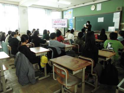 少し緊張した様子で教室に入りました。生徒会の方のお話や中学校の先生のお話,そして授業体験。