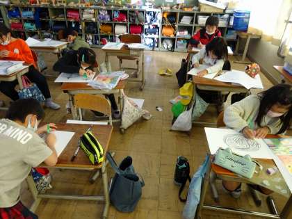 図画工作ではスチレン版画に挑戦しています。スチレンボードをへらで押さえてあとをつけていっています。