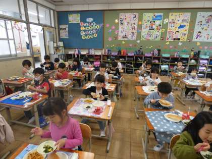 木曜日から給食が始まり,最初の給食はスパゲッティでした。りんごゼリーもついていてうれしそうな子どもたちでした。