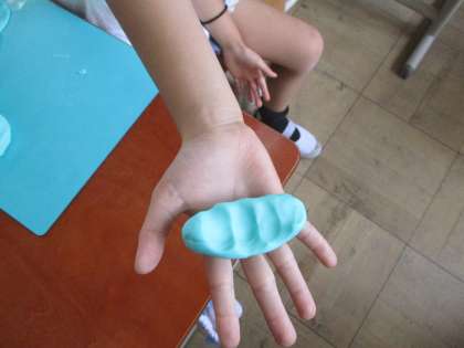 片手で握ったり,両手で握ったり,握って伸ばしたり,いろいろなにぎり方を試しました。「いもむしみたい!」「犬の手みたい!」などできた形から想像を膨らませていました。