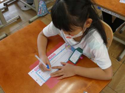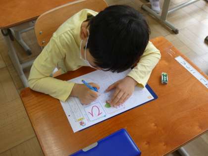 ひらがなも12個目の学習になりました。書く時には正しい姿勢と,えんぴつの持ち方に気を付けて書いています。今日はひらがなの学習をしたあとに,自分の名前も書きました。
