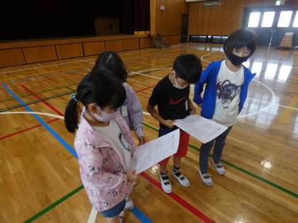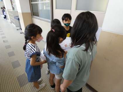 今日は1,2時間目に2年生のお兄さん,お姉さんと一緒に学校探検にいきました。来週の遠足にいくなかよしグループで活動をしました。