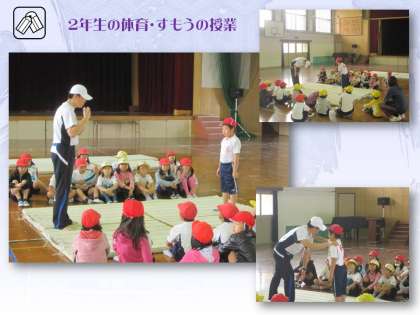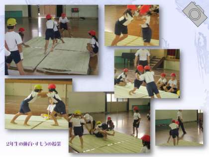 体育館での2年生の体育の授業。すもうの授業です。「押しずもう」のルールを説明してもらってから,さっそくグループに分かれて「はっけよい!」と,すもうを取り始めました。