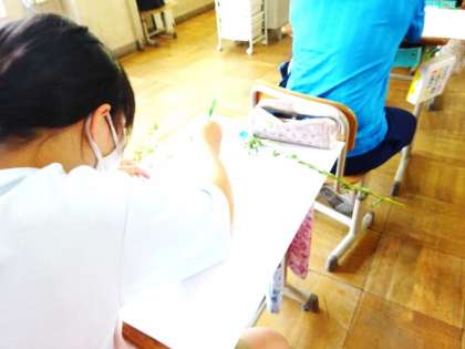 学校に咲いている植物を画用紙の横においてスケッチしました。