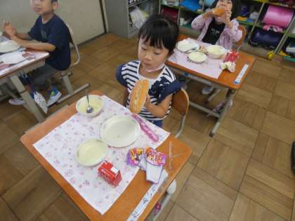 スプーンを使ってパンに切れ目をいれて,マヨネーズを和えたハムサンドの具をはさみます。
