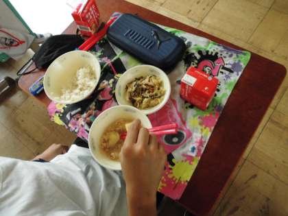 今日の給食は,ごはん,牛乳,じゃがいものそぼろ煮,ごま酢煮です。