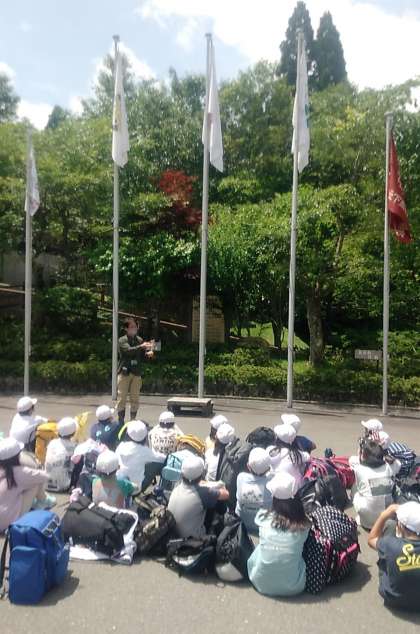 入所式を終えました。校歌をかけて、校旗を上げました。所員さんが、山の家に咲いている花を紹介してくださいました。