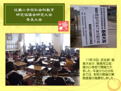 11月18日(金)に,奈良市立佐保川小学校において,”近畿小学校社会科教育研究協議会研究大会・奈良大会”が開催されました。全学級での授業公開や大会主題の提案等が午前中に行われ,午後からは,近畿各府県からの実践提案がある研究分科会が学年別に行われました。