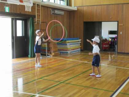 フラフープや棒を使った遊びに挑戦しています。