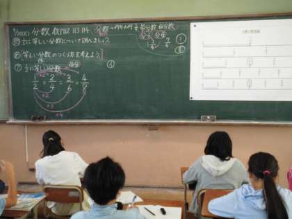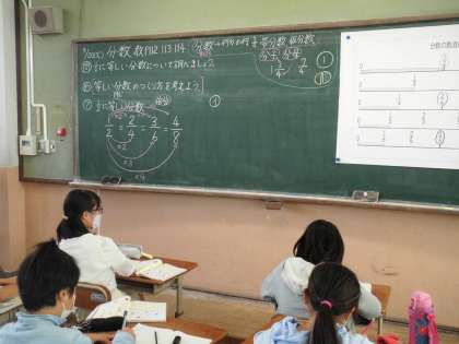 分数とは?2分の1と等しい分数は?など,みんなで数直線を見ながら確認しました。