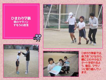 ひまわり学級では,体力をつけること,朝から気持ちよく活動をスタートさせることをめあてに,朝マラソンをしています。1周走るごとにシールを1枚,赤白帽に貼ってもらい,走り終えたら,それをカードに貼り直すのです。これまでにどれだけの距離を走ることができたでしょうか。