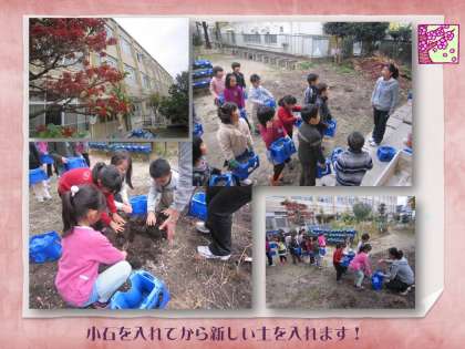 1年生が,生活科の授業で,チューリップの球根を鉢植えしていました。春には,色とりどりの花が咲くことでしょう。楽しみですね!