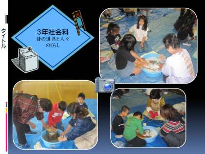 今日は,3年生の社会科の授業「昔の道具と人々のくらし」での体験的な活動が行われました。本校では,例年,地域女性会の皆さんのご協力により,「洗濯板で洗濯をする」授業を行っています。今年度は,PTA本部役員の皆さんも加わって下さいました。おかげさまで,3,4人の子どもに対して1人の方が指導に入って下さるという恵まれた条件での学習となりました。