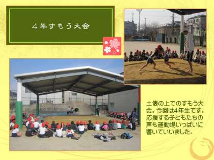 12月7日(水)に,土俵で,4年生のすもう大会が行われました。運動場いっぱいに聞こえる声で応援をしながら,子どもたちは大変な盛り上がりを見せていました。本物の土俵で,力いっぱいにすもうをとっている姿がとても良かったです。