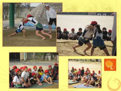 低学年が体育館に敷いた相撲マットで,中学年と高学年が土俵で,すもう大会を行いました。9日には,3年生も大会を行いましたよ。