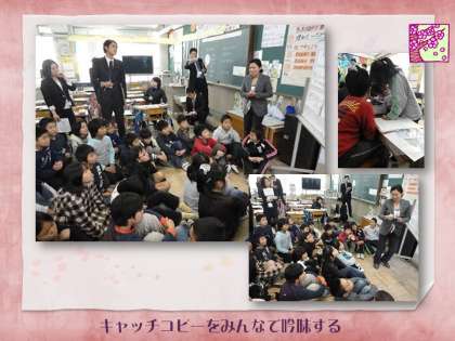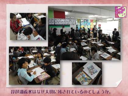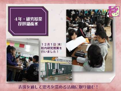 12月1日〈木〉に行われたのは,4年・研究授業「琵琶湖疏水」でした。ここのところ本校では,単元の終りの「まとめ・発展」にポイントをおいて,研究授業をしてきています。この日の授業では,琵琶湖疏水について学習してきた子どもたちが,「なぜ今でも琵琶湖疏水は大切に残されているのか。」を考えます。琵琶湖疏水のキャッチフレーズをつくって,それを見比べながら,文化遺産としての琵琶湖疏水の存在意義を探りました。子どもたちは,大変いきいきと活動し,積極的に意見を述べていました。