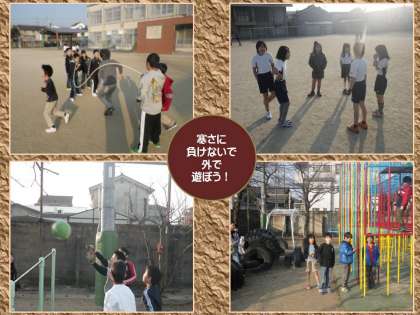 朝夕,ずいぶんと寒くなってきました。それでも,学校に登校するとすぐに,友だちと誘いあって,運動場に飛び出す子どもたちがいます。長縄をしたり,総合遊具で遊んだりして,とても楽しそうです。朝から,できるだけ体を動かすようにしたいですね。「おはようございます!」という朝の挨拶も,元気よくしてくれるので,とても気持ちがいいですよ。