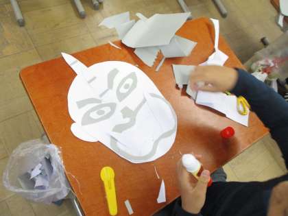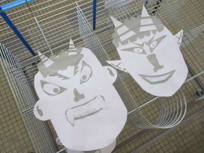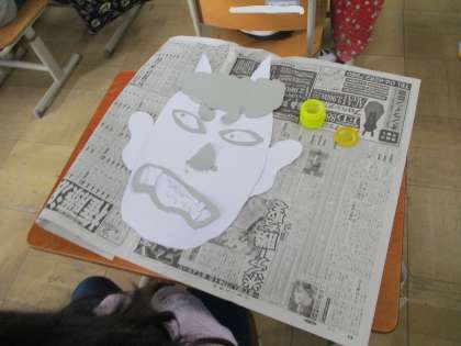 紙版画に取り組んでいます。鬼の表情を工夫して版を作っています。