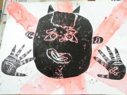 今日は、インクとローラーを使って紙版画を完成させていきました。