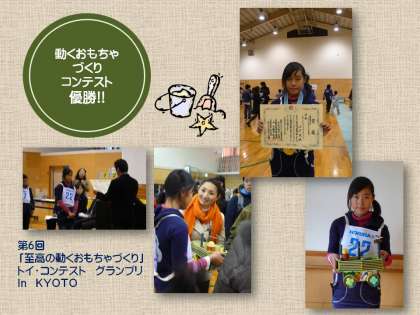 昨年12月17日(土)に第6回「至高の動くおもちゃづくり」トイ・コンテスト グランプリ in KYOTO が行われました。当日は,京都市を中心に,一部他府県からの参加も加えて,およそ200名ほどの子どもたちが作品を競いました。これに下鳥羽小学校の美術部からも2名が参加しました。