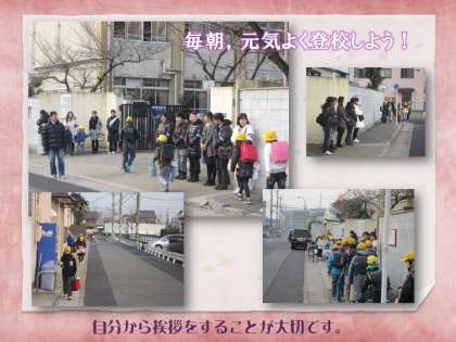 挨拶は,学校の指導だけでは出来るようになりません。それだけでは難しいのです。各家庭でも家族の中でまず挨拶ができるように,普段から声をかけて頂くことが大切です。よろしくお願いします。