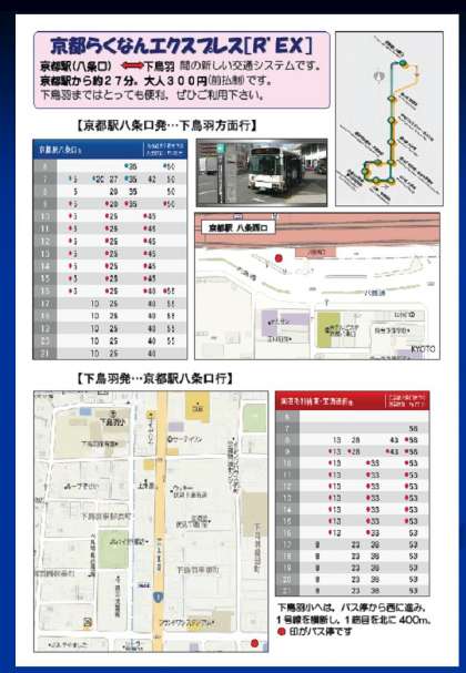 京都らくなんエクスプレス[R'EX]とは,京都駅から下鳥羽への新しい交通アクセスです。八条口から下鳥羽まで約27分です。現在は平日のみの運行です。京都駅からであれば市バスよりも便利かも。一度ご利用してみて下さい。
