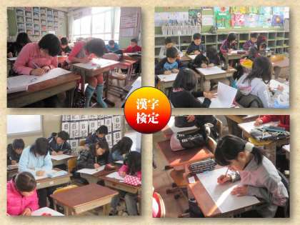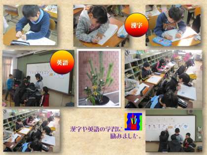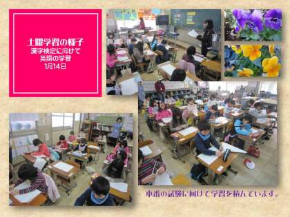 土曜学習では,2月に受ける漢字検定の試験に向けて,本番と同じようにして模擬試験を受けることにしました。試験というものに慣れていないと,本番でどうしてよいか分からない場合がありますね。こうした準備が必要です。みんな真剣な面持ちで問題を解いていました。その後は,英語の学習です。まだ学習が始まる前から,先生を囲んで英語の話題に夢中になっていました。