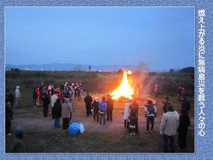 集う人々の顔が炎で照らされ,あたりには荘厳な雰囲気が漂います。無病息災を願う人々の心が,火の粉と共に高く舞い上がるかのようです。新年の幕開けを改めて強く感じることができました。