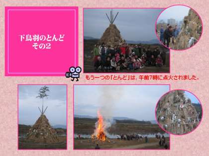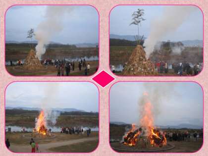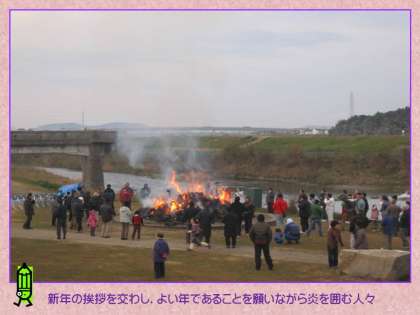 今では,下鳥羽地域の「とんど」は二つの町を残すのみとなりました。もう一つの「とんど」は,鴨川をやや上へ離れた所で,午前7時から行われました。すでに明るくなった空の下で,今度はまた,最初から和やかな雰囲気を醸し出しながらの点火です。わずか30分の時間の差ですが,自然の移ろいが,また新たな場の空気をつくっていました。ただ,それでも人々が願うことは同じなのでしょう。「どうぞ今年がよい年になりますように…。」と。