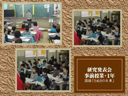 国語「たぬきの糸車」の授業です。1年生の子どもたちが生き生きと学習する姿を見せられたらと思っています。登場人物(おかみさんやたぬき)の気持ちを想像しながら,そしてそれを膨らませて音読ができるといいのですが…。入学以来ほぼ一年たった子どもたちの成長ぶりを見て下さい。