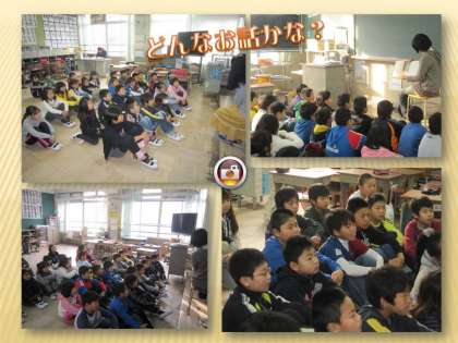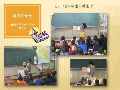 地域ボランティアの皆さんによる読み聞かせ。19日は4年生の教室で行われました。選んで頂いた本は「ゆずちゃん」「とうちゃんの凧」でした。子どもたちが本を好きになれる環境づくりに大きな役割を果たして頂いています。とてもうれしいことです。次は3年生の教室で24日に行って頂きますよ。お楽しみに!