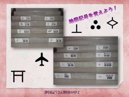 階段の上り下りの際にも,学習ができるように,掲示物を工夫しています。「世界の国旗」「地図記号」のシリーズです。君はどれだけ覚えられるかな。