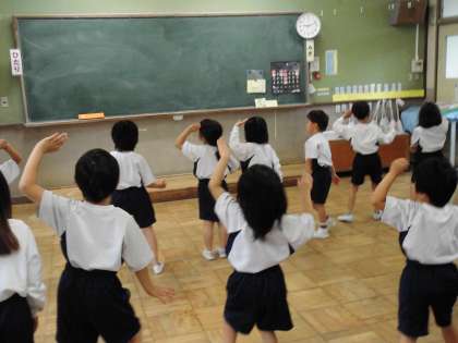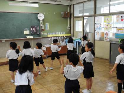 月曜日は朝から少し雨が降ってきたので、教室でからだほぐしの運動をしました。