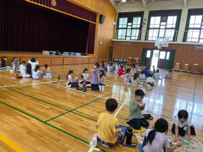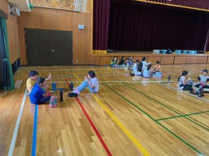 天候不良により、社会見学は延期となってしまいましたが、体育館でみんなでお弁当を食べました。