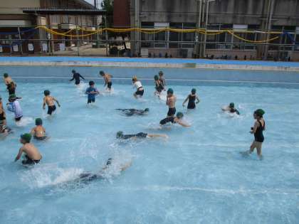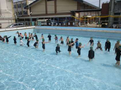 水をかけ合ったり、ワニ歩きをしたり、楽しく活動していました。