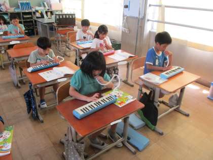 音楽では歌に合わせて鍵盤を演奏しています。