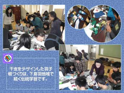 地域女性会の皆様に御指導頂いての「羽子板づくり」。その第二回目が行われました。同じ子どもたちが前回の制作からの続きに取り組みます。下鳥羽地域の伝統学習として,土曜学習に位置付けており,教職員やPTAの皆様も指導者として加わっています。さてどんなすばらしい羽子板が完成するでしょうか。