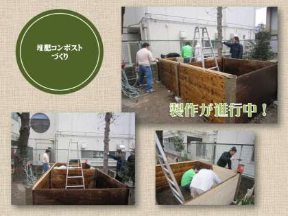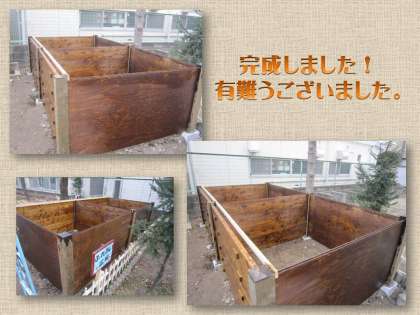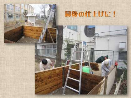 おやじの会の皆様が,一日がかりで「堆肥コンポスト」を完成させて下さいました。実際に堆肥になるには,ここで長い時間をかけなければならないようですが,きちんと保存できる,しっかりしたコンポストを作って頂きました。寒い中を本当に有難うございました。