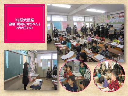 先週の木曜日,1年の研究授業がありました。単元は「どうぶつの赤ちゃん」でした。1年生の子どもたちが,ずいぶんとたくましくなったことを感じました。しっかりした気持ちで授業を受けている様子がよく分かりました。自分の意見を頑張って言おうとしている子どもたちが多くなりましたね。