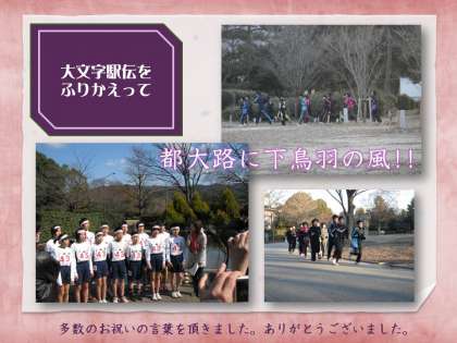 今回,本校の子どもたちが,京都市小学校大文字駅伝大会において,「準優勝」という立派な成績をあげたことに対して,地域や保護者の皆様,また本校にかかわりのある皆様から,たくさんのお祝いの言葉を頂きました。改めまして御礼を申し上げます。本当に有難うございました。