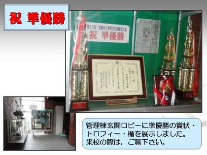 大文字駅伝・準優勝で頂いた賞状とトロフィー・楯を職員室のある校舎(管理棟)の玄関ロビーに展示しました。