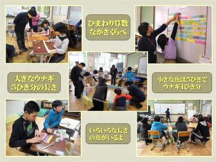 ひまわりの池には,たくさん魚がいます。一番長い魚はウナギです。一番小さな魚(チビ魚)の5ひき分の長さです。今日は,ウナギ5ひき分の長さになるように魚つりをします。池にはいろいろな長さの魚がいます。うまく釣って5ひき分になるようにしていきます。子ども達は,考えながら魚釣りをしています。チビ魚を25ひき釣ってる子。上手く組み合わせている子など様々ですが,みんな良く考えていました。